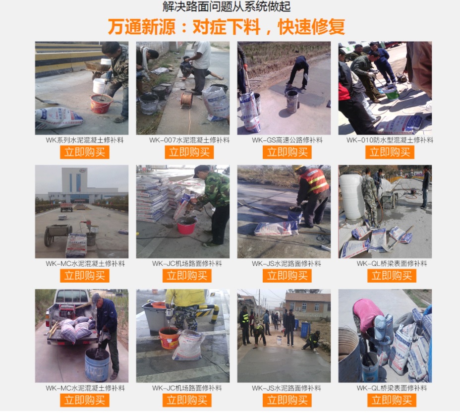 大慶萬通新源科技有限公司獨有的混凝土路面高強速補料,是水泥混凝土路面病害修復(fù)的好材料。疲勞、凍融循環(huán)、彎曲壓力、滲水和基層破壞等原因都會引起水泥路面的破損,從而帶來高昂的維護(hù)費用。與以往的剛性修補方法不同,混凝土水泥路面維修速補膠提供了一種獨特的柔性修補產(chǎn)品和技術(shù),高柔性、高抗拉性,可跨伸縮縫施工和高抗壓性使得混凝土快補產(chǎn)品為水泥混凝土路面提供了******性的修補。傳統(tǒng)的剛性修補方案,如環(huán)氧砂漿和快干水泥產(chǎn)品,由于其自身的粘結(jié)失效,抗疲勞性低以及與原路面不同的伸縮系數(shù),修補面會在短時間內(nèi)失效或產(chǎn)生新的裂縫,需要反復(fù)修補,有效期短且費用高昂。大慶萬通新源科技有限公司的混凝土水泥路面維修速補膠可以隨原路面一起伸縮,移動,從而避免了粘結(jié)失效和產(chǎn)生新裂縫。萬通快補產(chǎn)品優(yōu)異的粘結(jié)性、柔韌性和高防滑性,特別適用于水泥路面的淺層粘合修補,多邊角混凝土板層修補,跨伸縮縫修補以及路面沉陷修補。萬通混凝土病害修補料針對混凝土起皮起沙、斷板裂縫、蜂窩麻面、坑槽露石子、漏筋掉皮、橋梁的掉皮漏筋快速通車使用時間長。應(yīng)用萬通快補產(chǎn)品,施工后一天就可以恢復(fù)交通。大慶萬通新源科技有限公司的萬通水泥路面維修速補膠適用于高速公路、機場路面、農(nóng)村村村通路面、廠坪、學(xué)校操場、市區(qū)公路、小區(qū)路面、橋梁、水泥路面的修補。使用萬通特快補材料修補路面可以一勞永逸! 水泥地面起砂怎么辦,混凝土修補劑混凝土地面起砂,混凝土地面修補,地面起砂怎么辦,